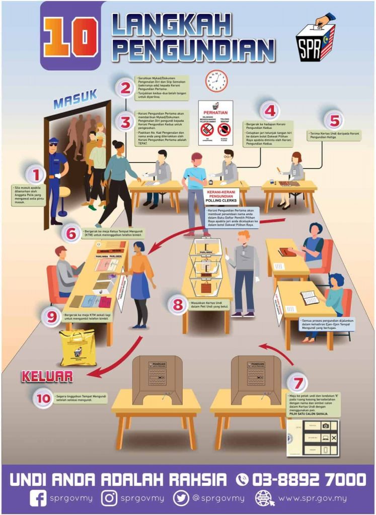 Info lanjut mengenai 10 langkah pengundian, sila layari laman web SPR iaitu https://www.spr.gov.my/.