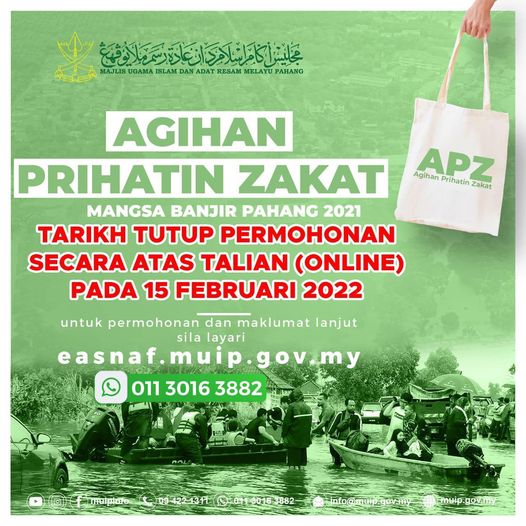 Mangsa banjir di Negeri Pahang pada tahun 2021 kini boleh mendapatkan bantuan menerusi Agihan Prihatin Zakat (APZ) menerusi Majlis Ugama Islam dan Adat Resam Melayu Pahang (MUIP).