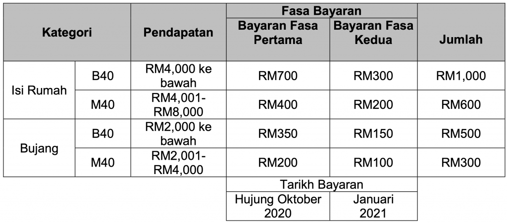 Bagi kategori B40, bantuan sebanyak RM700 akan disalurkan pada Oktober manakala baki RM300 pada Januari 2021.