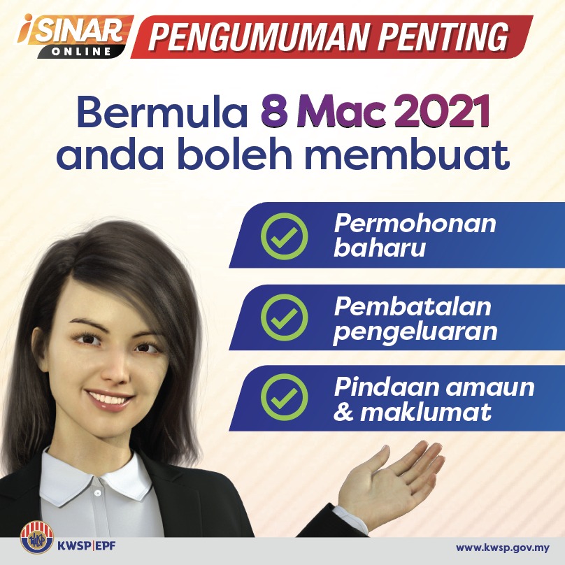 Bermula 8 Mac 2021, para pencarum KWSP di seluruh negara kini boleh meminda amaun pengeluaran atau membatalkan pengeluaran kemudahan i-Sinar KWSP mereka yang telah mereka mohon sebelum ini.