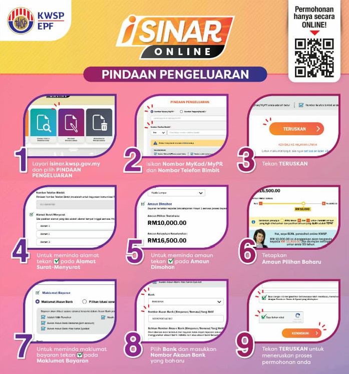 Semua permohonan tersebut boleh dilakukan secara atas talian di https://isinar.kwsp.gov.my/ tanpa perlu pergi ke mana-mana Pejabat KWSP untuk membuat permohonan.