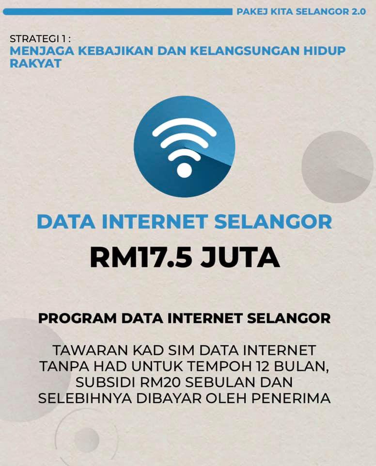 Menerusi pemberian Data Internet Selangor ini, rakyat Selangor yang layak akan menerima pemberian kad SIM dan langganan data internet secara percuma selama 12 bulan dengan sasaran seramai 70,000 penerima.