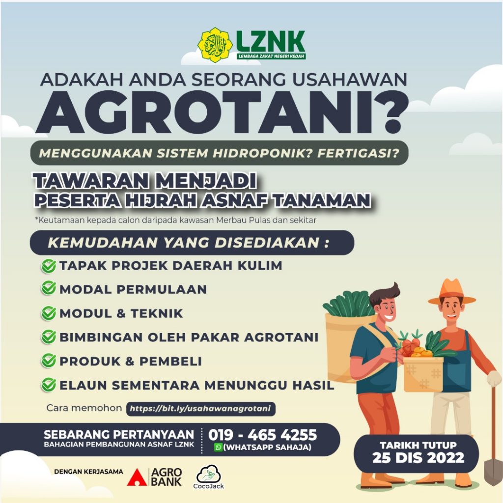 Usahawan agrotani belia adalah dialu-alukan untuk menjadi peserta Hijrah Asnaf Tanaman bagi mendapatkan bantuan yang disediakan oleh pihak Lembaga Zakat Negeri Kedah (LZNK).