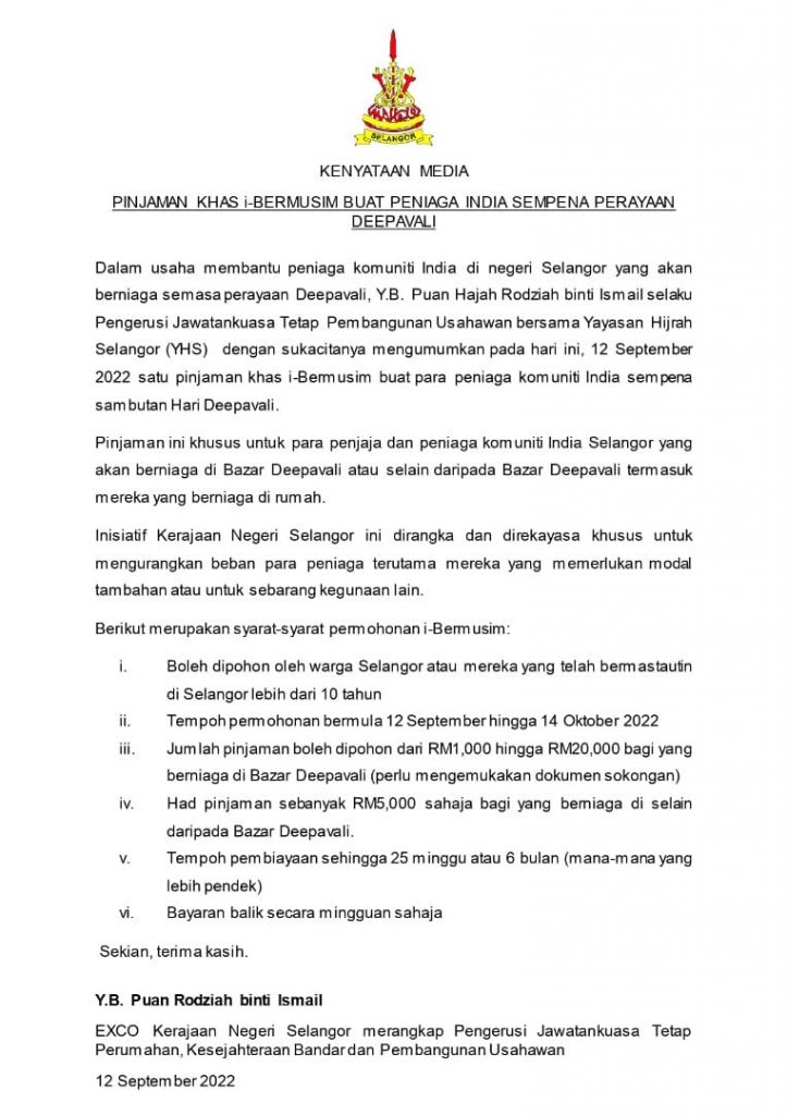Peniaga komuniti India di Negeri Selangor kini boleh memohon pinjaman khas sempena sambutan Hari Deepavali yang bakal menjelang menerusi i-Bermusim.