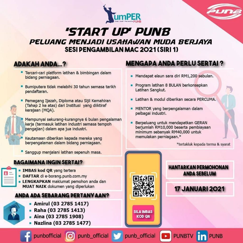 Bagi anda yang ingin menjadi usahawan muda yang berjaya, kini anda boleh menyertai program JUMPER ‘Start Up’ PUNB bagi pengambilan Mac 2021 yang dikendalikan oleh Perbadanan Usahawan Nasional Berhad (PUNB).