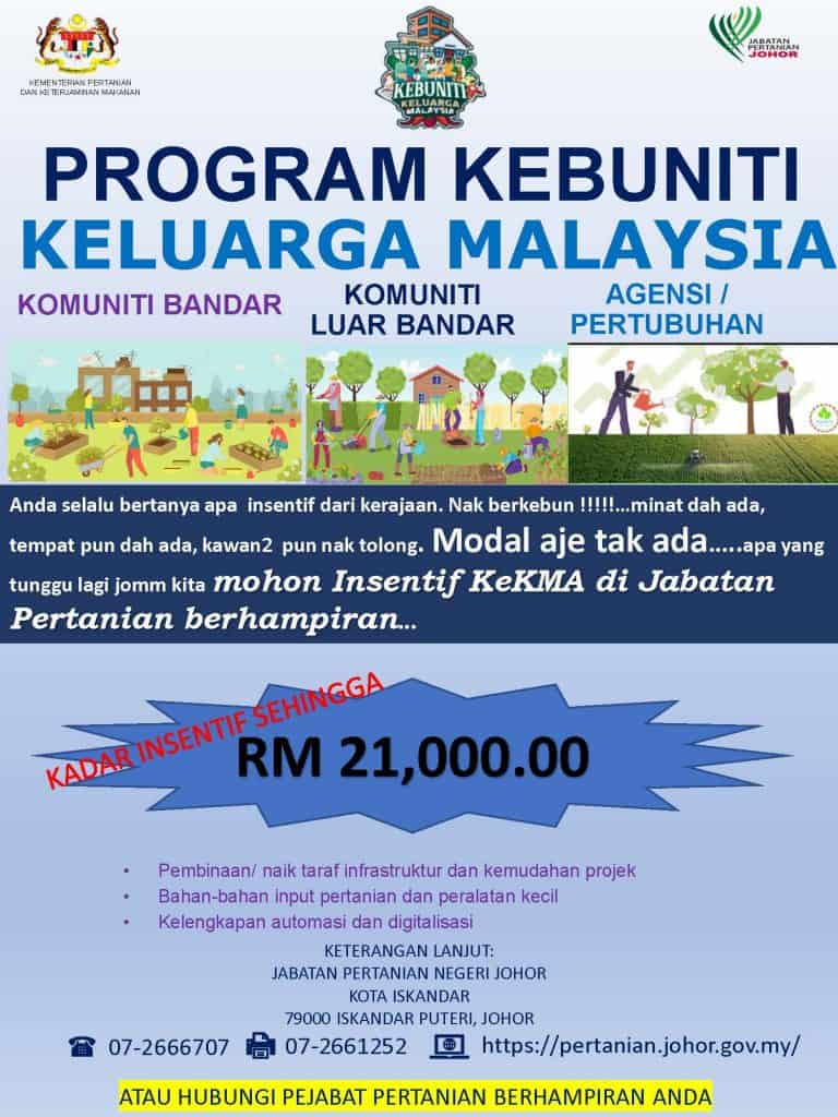 Jabatan Pertanian Negeri Johor telah membuka permohonan Program Kebuniti Keluarga Malaysia (KEKMA) bagi mereka yang berminat.