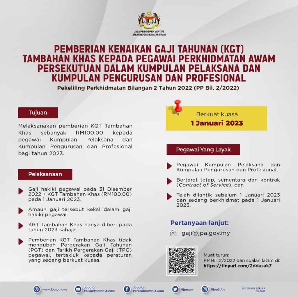 Pelaksanaan Kenaikan Gaji Tahunan (KGT) Tambahan Khas kepada penjawat awam berjumlah RM100 akan berkuatkuasa mulai 1 Januari 2023.