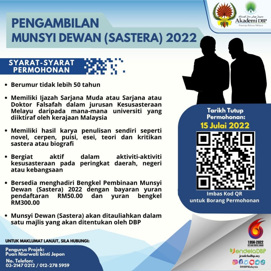 Dewan Bahasa dan Pustaka (DBP) telah membuka permohonan bagi individu yang berminat untuk memohon sebagai Munsyi Dewan (Sastera) bagi tahun 2022.
