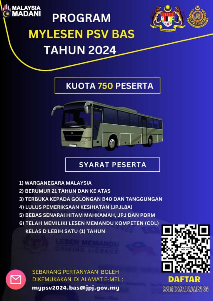 Melalui program ini, 750 rakyat Malaysia yang berkelayakan boleh mendapatkan lesen vokasional iaitu kelas Perkhidmatan Awam (PSV) E-Hailing/Teksi/Bas (BTM > 7,500 kg), secara percuma.