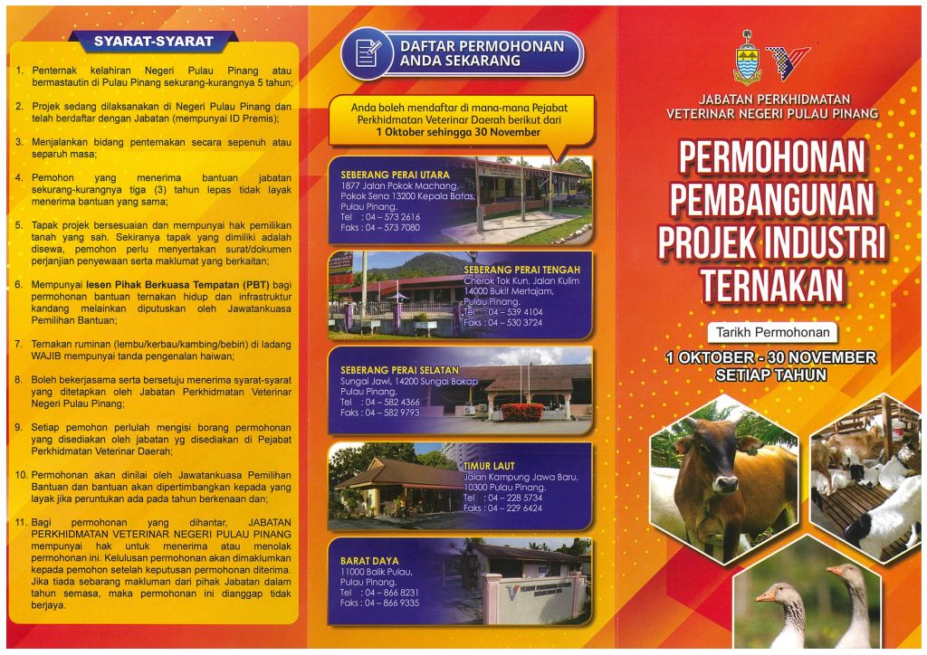 Jabatan Perkhidmatan Veterinar Negeri Pulau Pinang mengalu-alukan para penternak yang ingin memohon bantuan menerusi Pembangunan Projek Industri Ternakan.