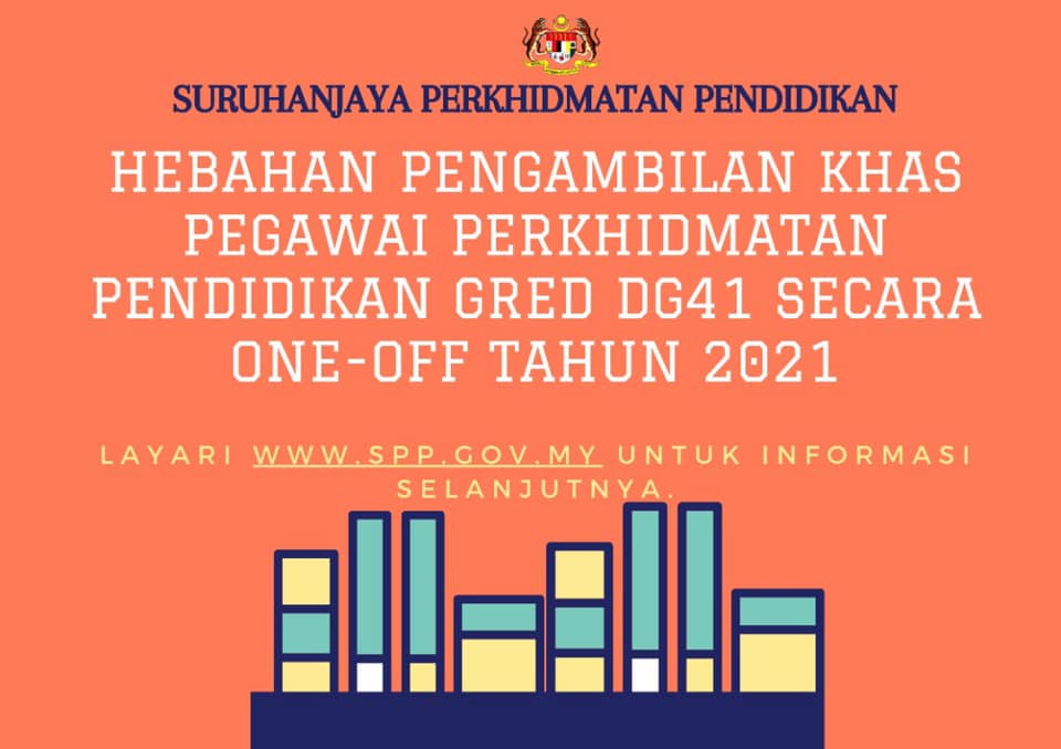 Suruhanjaya Perkhidmatan Pendidikan (SPP) telah membuka permohonan bagi individu yang berminat untuk memohon Pegawai Perkhidmatan Pendidikan Gred DG41 bagi tahun 2021.