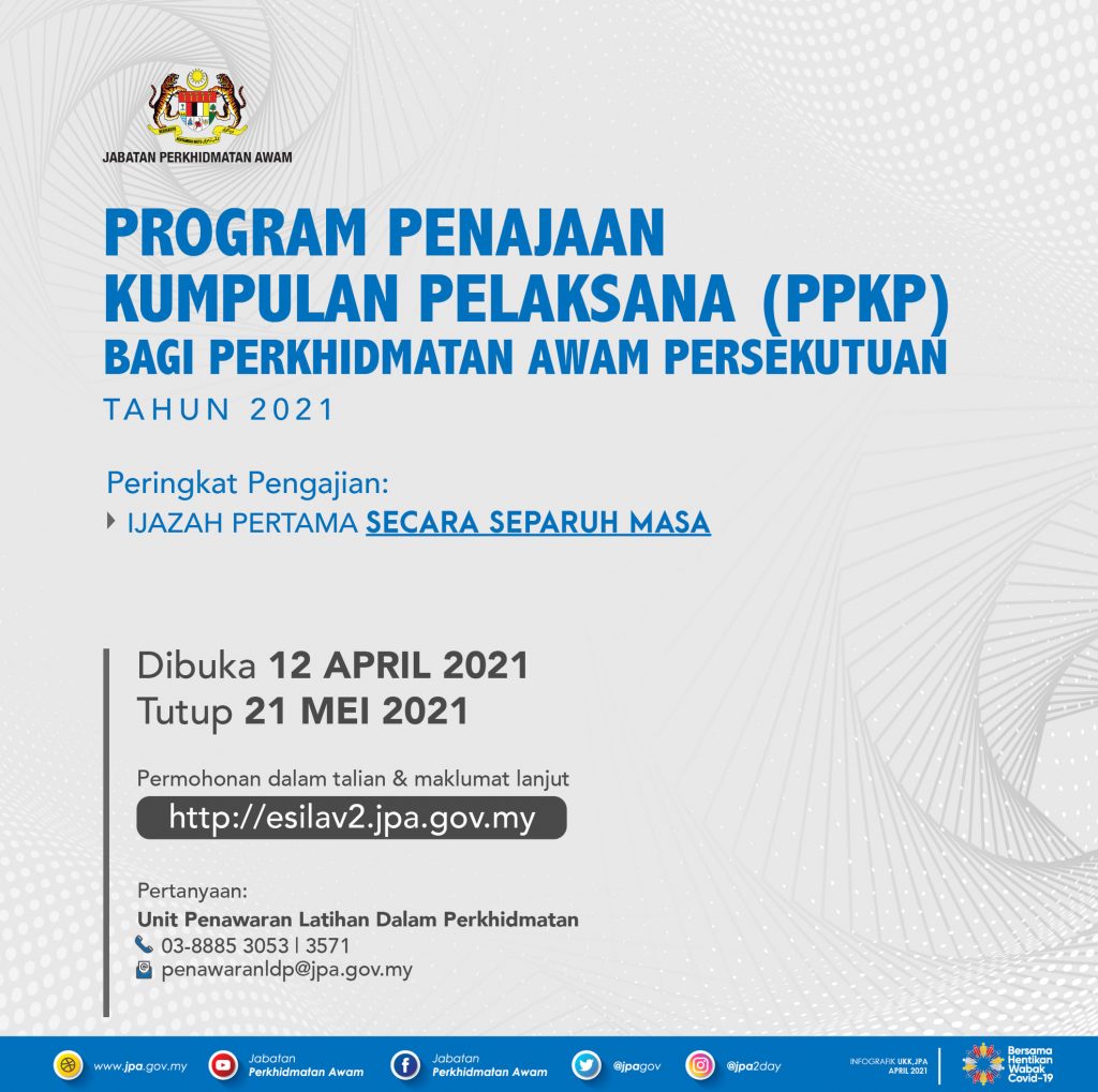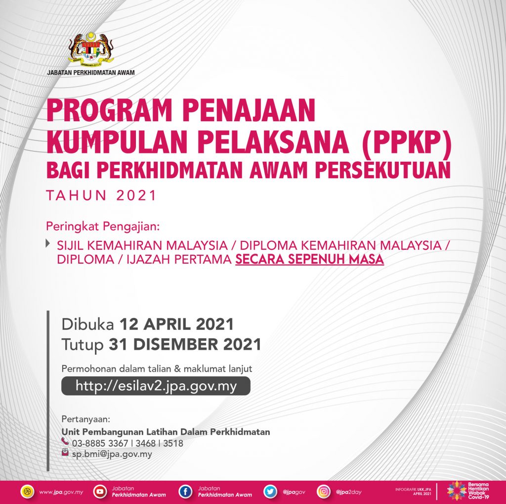 Jabatan Perkhidmatan Awam (JPA) telah membuka permohonan bagi Program Penajaan Kumpulan Pelaksana (PPKP) bagi perkhidmatan awam persekutuan untuk tahun 2021.