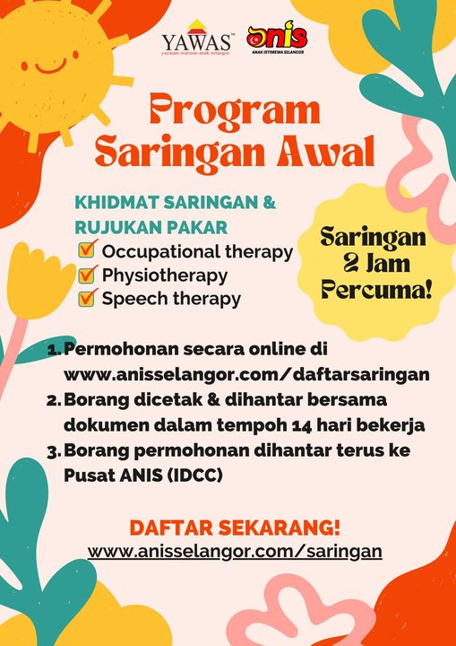 Kanak-kanak di Negeri Selangor yang tidak pernah melalui sebarang saringan/rujukan dari doktor pakar adalah dialu-alukan untuk menjalani Program Saringan Awal oleh pihak Anak Istimewa Selangor (ANIS).