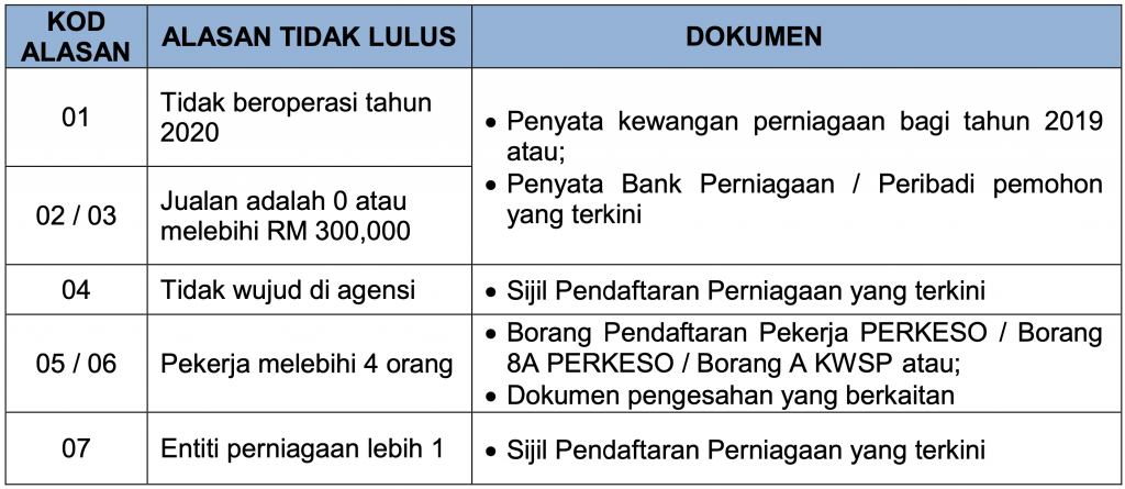 | 04 | TIDAK WUJUD DI AGENSI | Pemohon tidak berdaftar perniagaan dengan agensi berikut sebelum atau pada 31 Ogos 2020 |