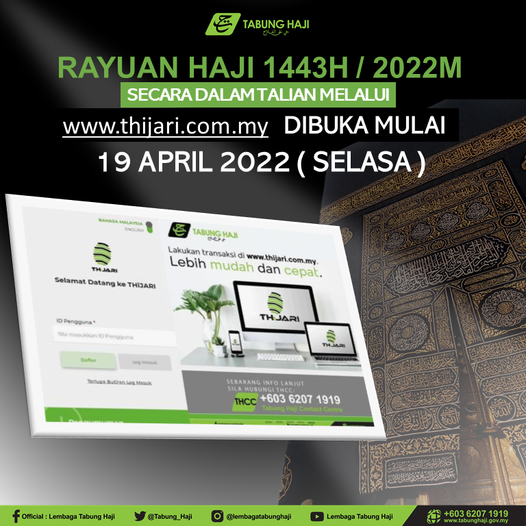 Pihak Tabung Haji memaklumkan permohonan rayuan Haji bagi tahun 2022 akan dibuka mulai 19 April 2022 melalui platform THiJARI.