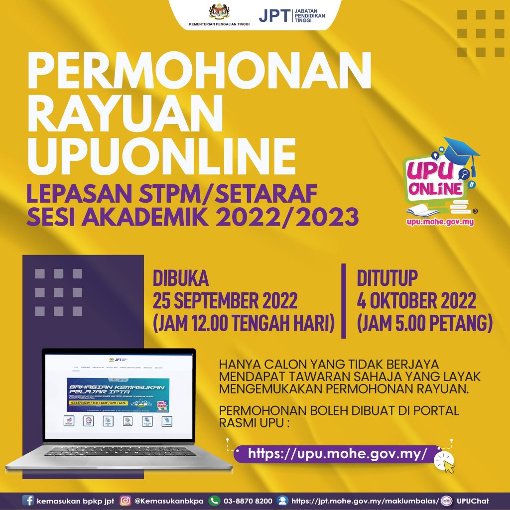 Pertanyaan lanjut mengenai semakan permohonan dan rayuan melalui UPUOnline lepasan STPM sesi 2022/2023, sila hubungi 03-8870 8200 atau email ke [email protected].