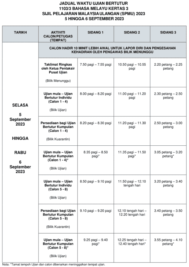 Jadi pastikan anda peka dengan tarikh dan waktu berlangsunya peperiksaan subjek yang anda bakal duduki dan pastikan yang anda telah hadirkan diri sekurang-kuranganya 10 mini lebih awal untuk melapor diri dan membuat pengesahan kehadiran oleh pengawas bilik menunggu.