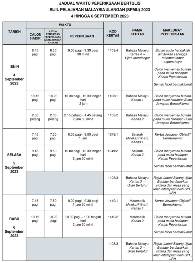 Bagi anda yang telah mendaftar, SPMU 2023 ini akan berlangsung selama tiga hari iaitu daripada 4 September 2023 sehingga 6 September 2023 seperti yang tertera dalam jadual di bawah.