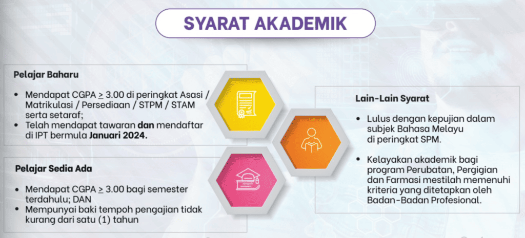 - Perlu emperolehi keputusan akademik sekurang-kurangnya PNGK (CGPA) 3.00 dan ke atas bagi peringkat pengajian Asasi / Matrikulasi / Persediaan / STPM dan yang setaraf dengannya. Pelajar juga telah mendapat tawaran dan mendaftar pengajian di IPT bermula Januari 2024.