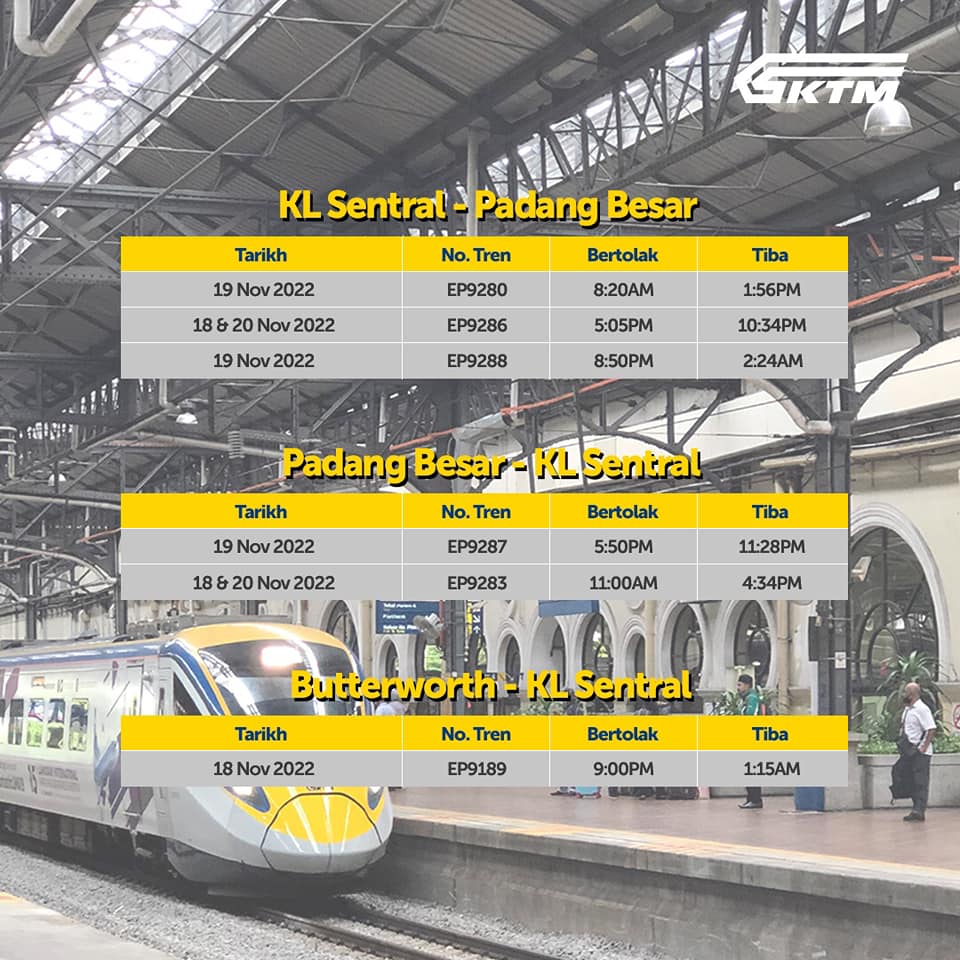 Perjalanan bagi tren khas akan berlepas pada 3.40 petang pada 18 November dari Stesen KL Sentral dan dijangka tiba pada 7.40 pagi pada 19 November di Stesen Tumpat manakala tren dari Stesen Tumpat akan berlepas pada 5.10 petang pada 20 November dan tiba pada 11.26 pagi 21 November.