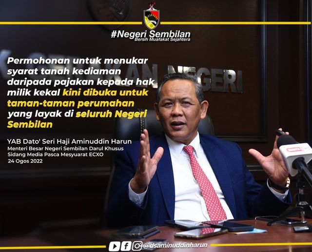 Maklumat lanjut mengenai penukaran status tanah daripada pajakan kepada hak milik kekal, sila layari Facebook YAB Menteri Besar Negeri Sembilan di pautan https://www.facebook.com/dsaminuddinharun.