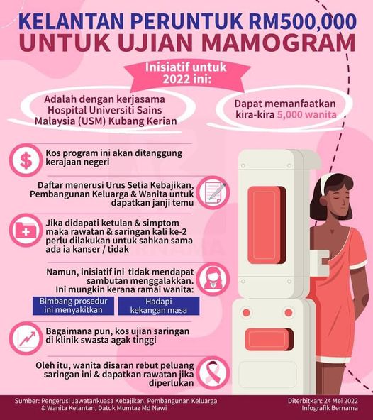 Pertanyaan lanjut mengenai inisiatif Ujian Mamogram ini, sila hubungi talian 09-747 6568 atau melayari laman web https://www.kelantan.gov.my/ untuk info.