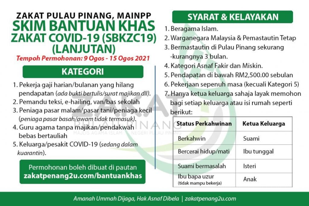 Zakat Pulau Pinang (ZPP) telah membuka permohonan bagi golongan yang terjejas akibat pandemik COVID-19 menerusi Skim Bantuan Khas Zakat COVID-19 (SBKZC19).